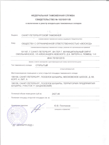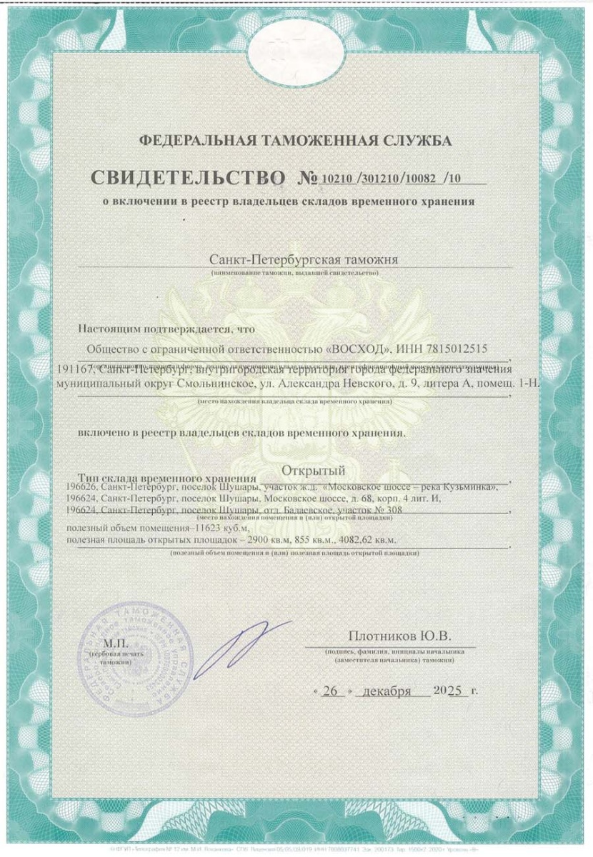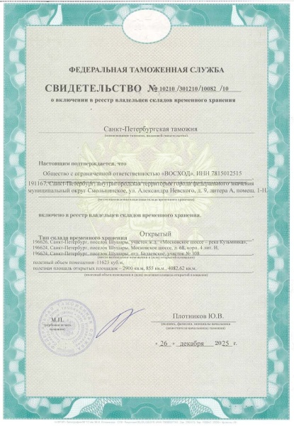О включении в Реестр владельцев складов временного хранения Свидетельство № 10210/301210/10082/10 от 26.12.2025